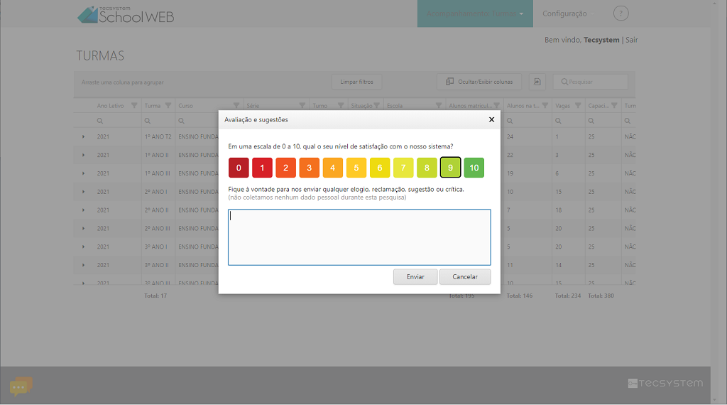 Em seguida, será apresentado um formulário onde o usuário poderá dar uma nota para o sistema (de 0 a 10) e digitar uma sugestão ou crítica, por exemplo. Para poder enviar seu feedback, o usuário é obrigado a dar uma nota para o sistema. O texto é opcional.