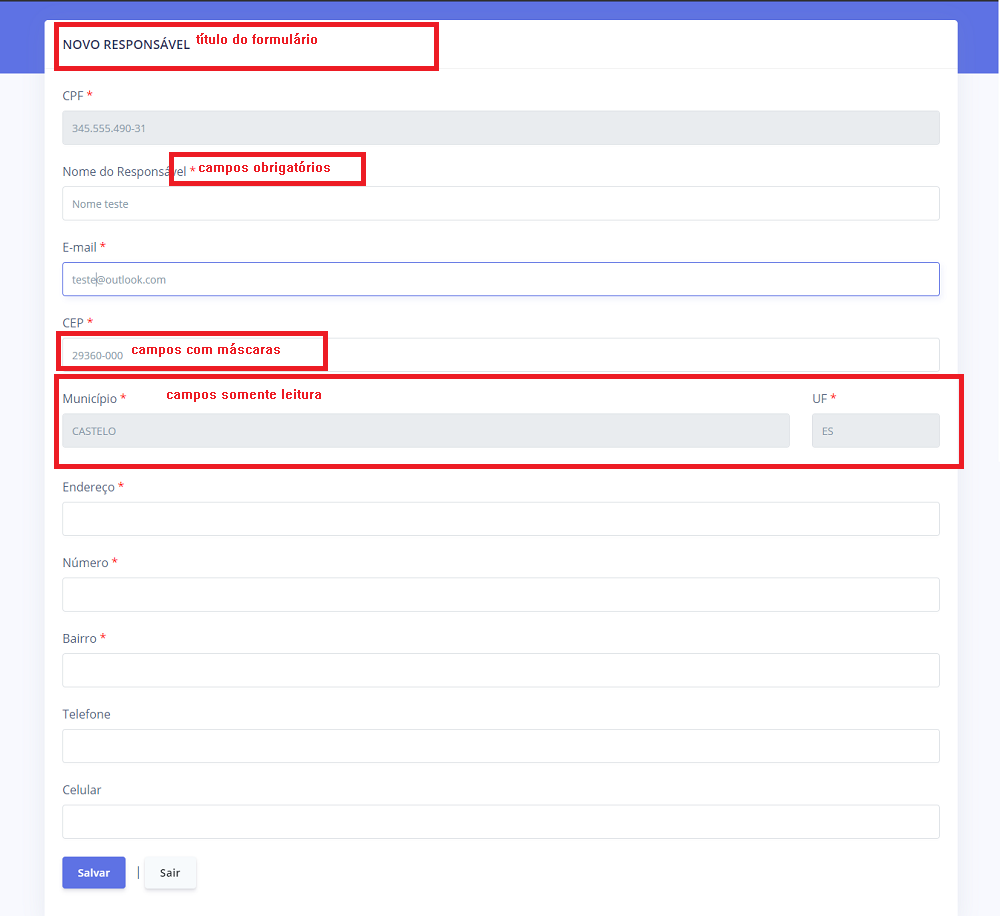 Para os formulários de inclusão e alteração o formulários deve contar com um botão para “Salvar” os dados e outro para “Voltar” para tela anterior;;