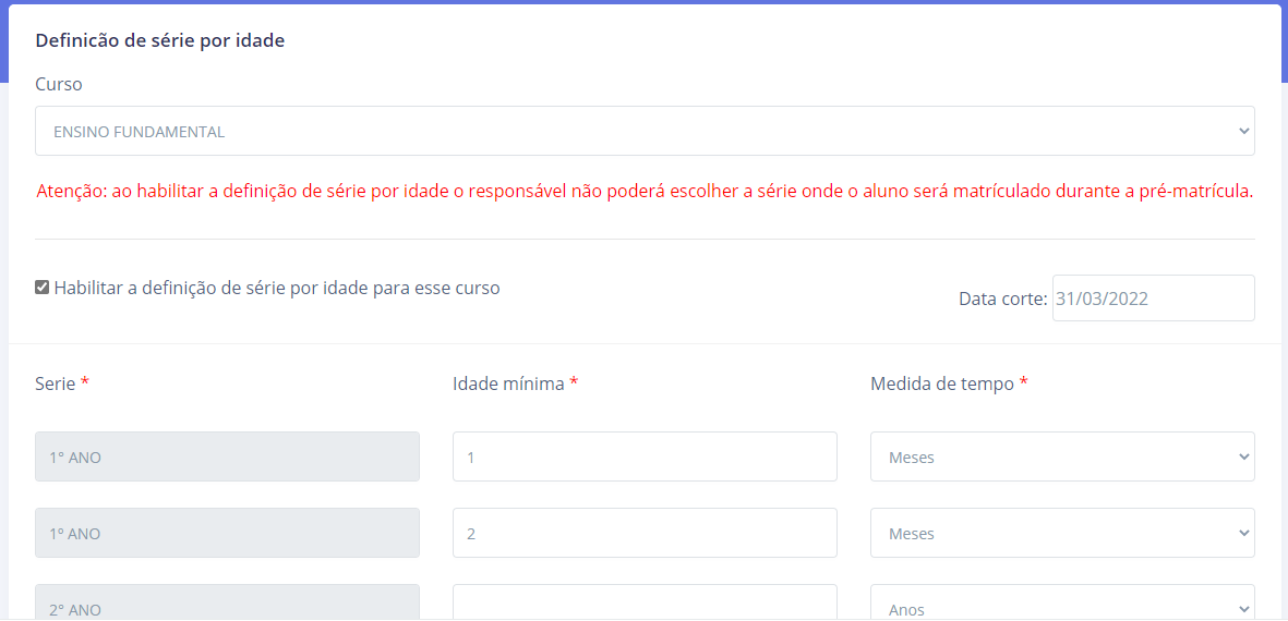 • Idade mínima: Idade que o sistema irá considerar no momento da pré-matrícula (a idade é calculada levando em consideração a data de nascimento do aluno e a data corte);
