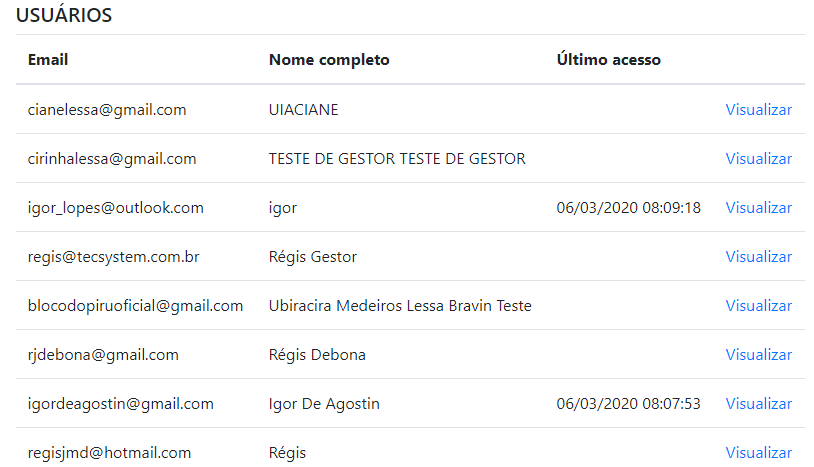A lista de usuários exibe todos os usuários cadastrados menos o usuário tecsystem, além disso, exibe a data do último acesso do usuário. Todos os itens da lista possuem uma opção “Visualizar”, que quando acionada o usuário será encaminhado a uma página de visualização dos dados do usuário e também poderá redefinir senha e email.