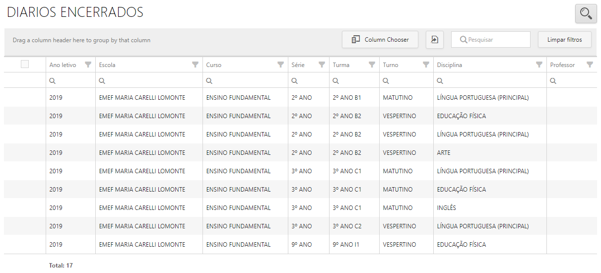 | Professor | Professor da turma/disciplina do diário encerrado. | STRING | SIM | |